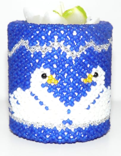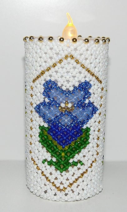 Kunststoffteelicht umnäht mit hochwertigen La Bella - Perlen. Kann auch als Windlicht genutzt werden.